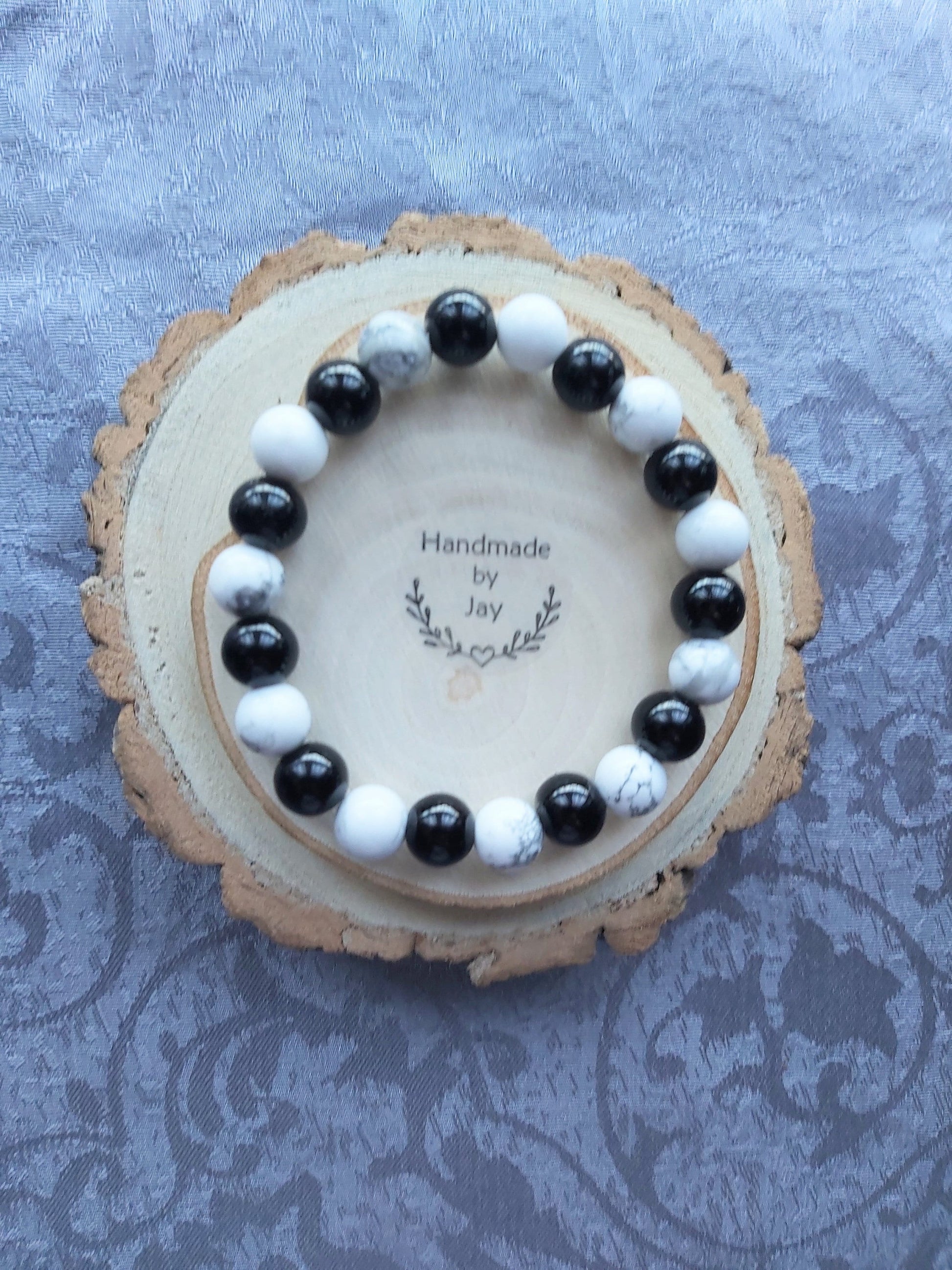 Handmade with 10mm White Howlite & Black Tourmaline for Protection, Anxiety/ Stress Relief Crystal Gemstone beads Beaded Bracelet which comes in free Gift Bag with Selenite Stick and Crystal Information Card.