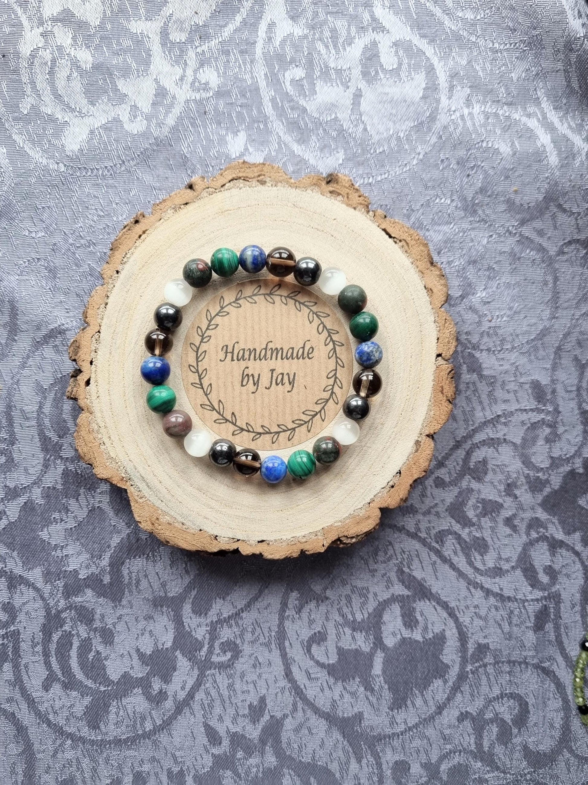 8MM TIGERS EYE , SMOKY QUARTZ, LAPIS, MALACHITE, SELENITE AND HERMATITE FOR MALE FERTILITY CRYSTAL BRACELET C