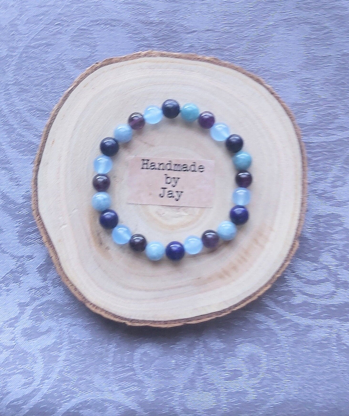 GENUINE 8MM LAPIS LAZULI, AQUAMARINE, AMETHYST AND ANGELITE OR BLUE CHALCEDONY CRYSTAL GEMSTONE BEADED BRACELET.