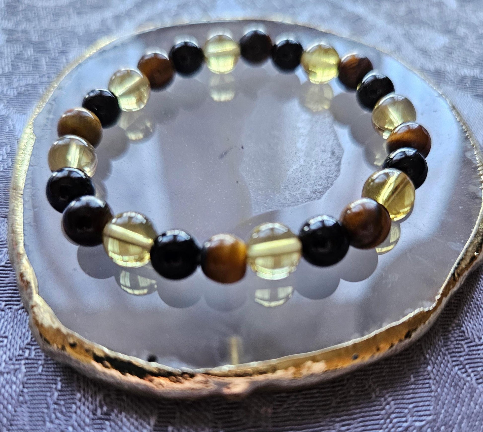 AAA Quality 8mm Citrine, Black Tourmaline and Tigers Eye for Good Luck and Prosperity Crystal Beaded Gemstone Bracelet