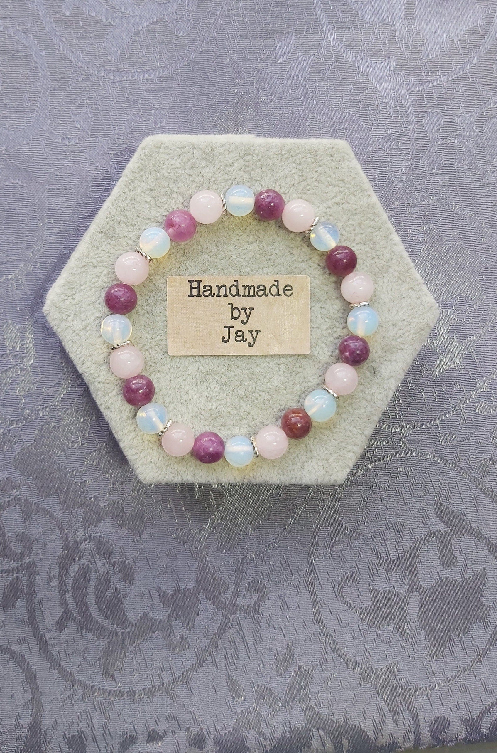 8mm Lepidolite, Moonstone & Rose Quartz Crystal Gemstone Beaded Bracelet Heart Chakra