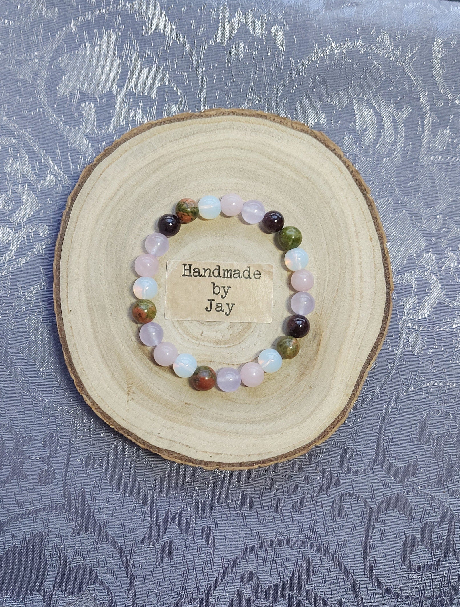 8MM MOONSTONE, LILAC JADE, GARNET and UNAKITE CRYSTAL GEMSTONE BEADED BRACELET COMES IN A FREE ORGANZA GIFT BAG.