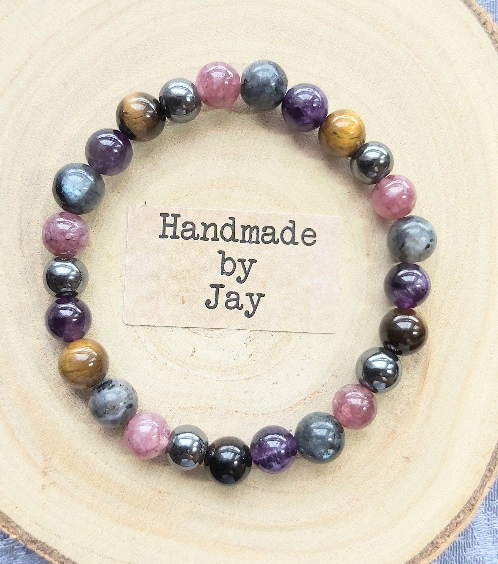 8MM LEPIDOLITE LABRADORITE, TIGERS EYE, HERMATITE & AMETHYST FOR ADDICTIONS, ANXIETY AND COMPULSIVE BEHAVIORS CRYSTAL HEALING BRACELET.