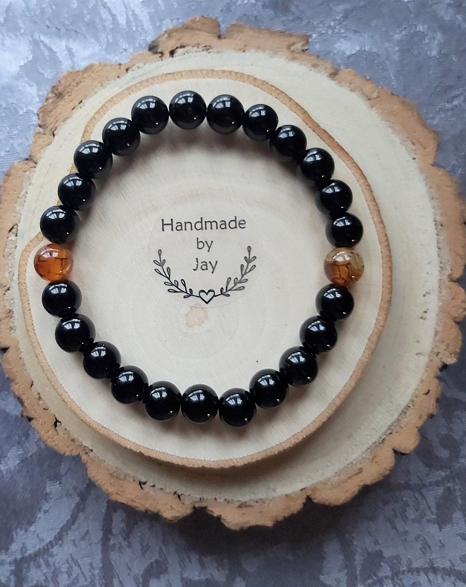 Handmade 8mm Black Tourmaline and Orange Dragons Vein Agate Crystal Gemstone Bracelet for Protection, Grounding and Yin-yang Energy