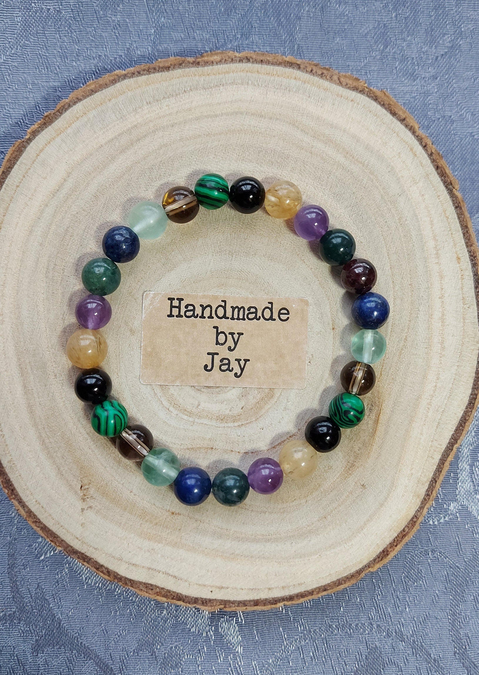 Handmade Crystal Healing Bracelet: Malachite, Amethyst, Black Tourmaline, Moss Agate, Lapis Lazuli & Citrine