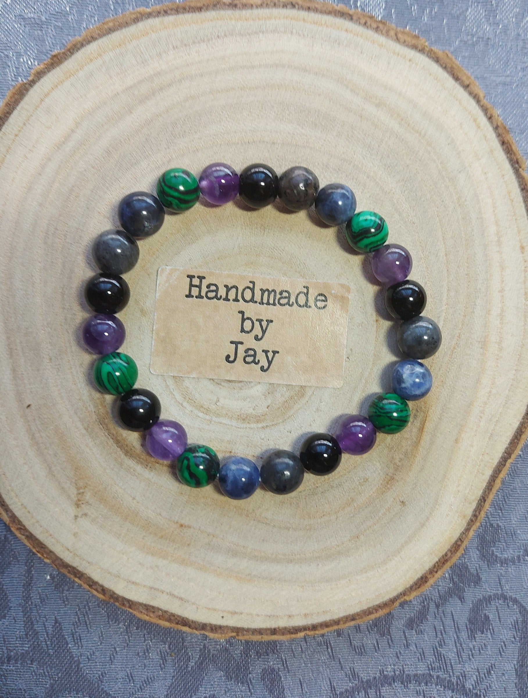 Handmade Natural 8mm Green Malachite, Amethyst, Lapis Lazuli, Aquamarine, Black Tourmaline & Moss Green Crystal Gemstone Beaded Bracelet.