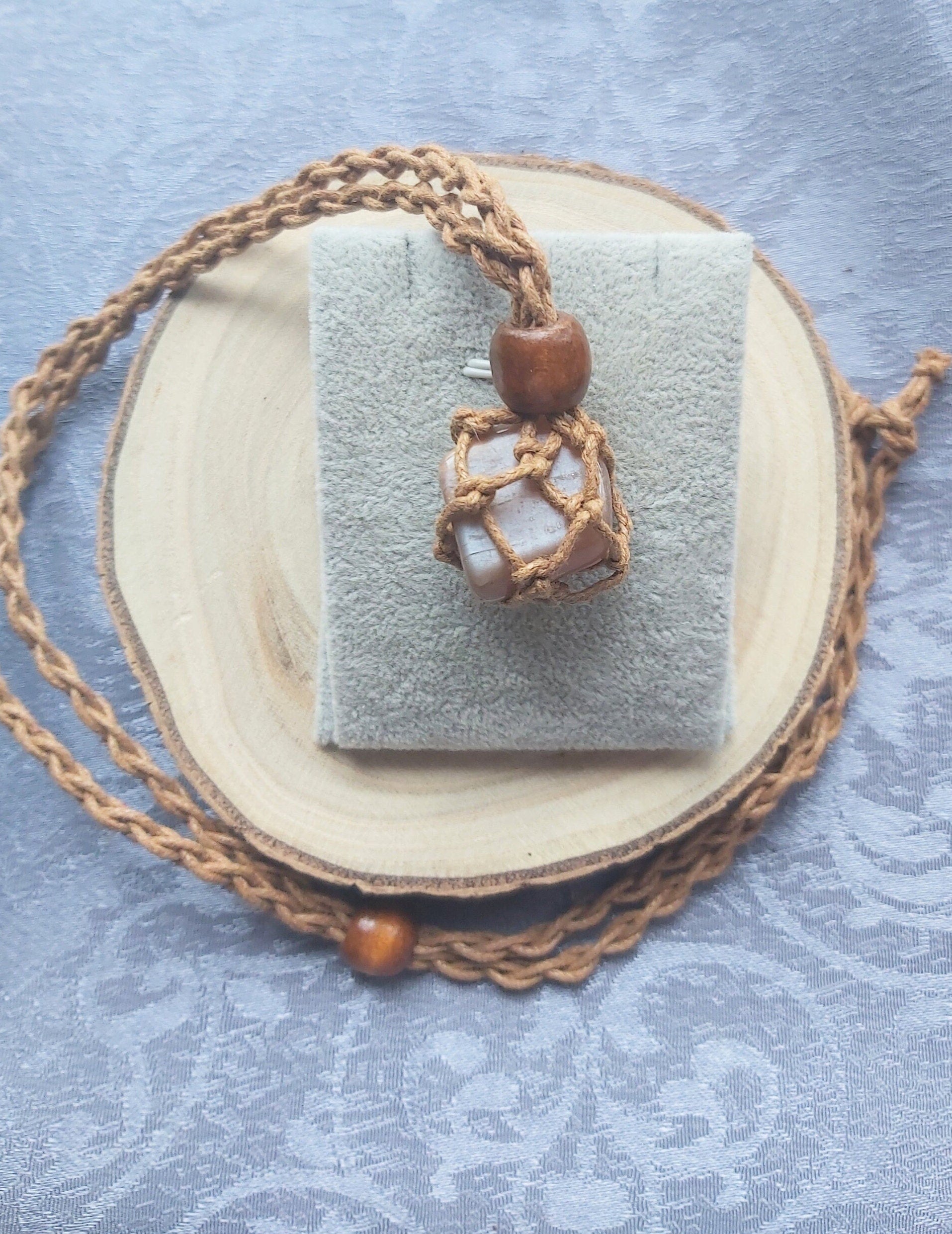Natural Peach Moonstone Crystal Gemstone Macrame Pendant.