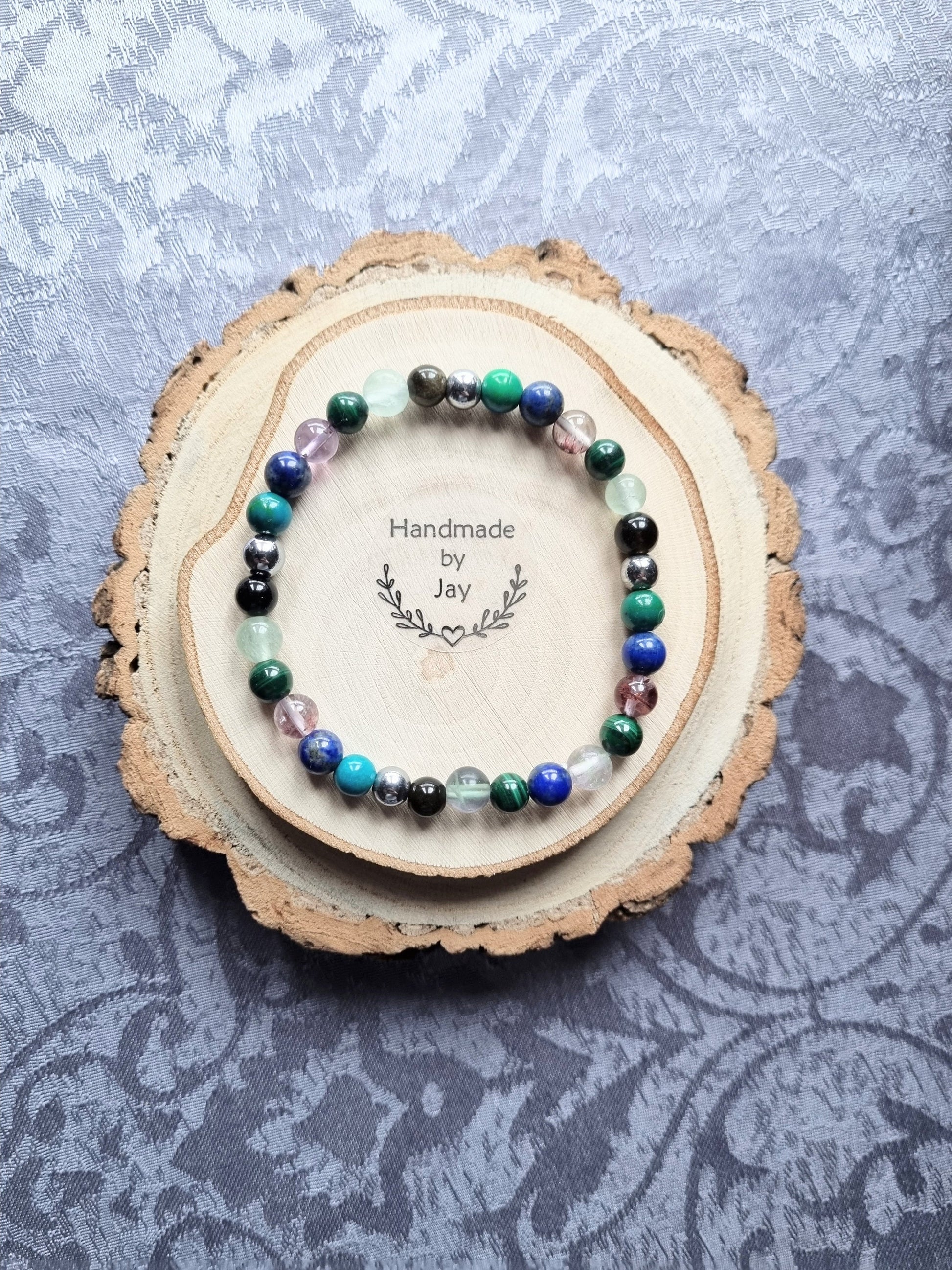 6MM ARTHRITIS, CHRONIC BACK PAIN AND CIRCULATION SUPPORT CRYSTAL HEALING BEADED GEMSTONE ELASTICATED BRACELET.