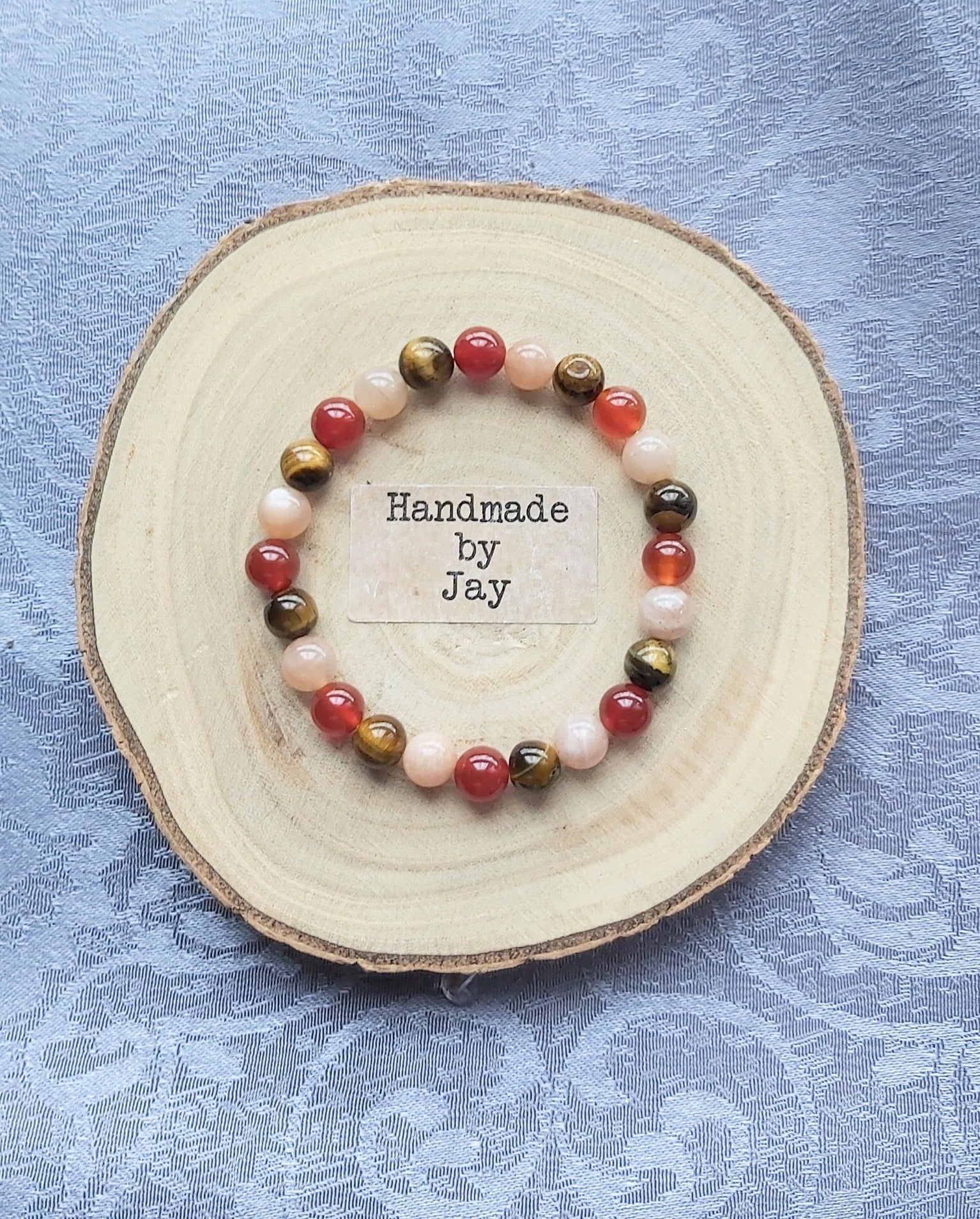 8MM SACRAL & SOLAR PLEXUS CHAKRA BRACELET USING SUNSTONE, CARNELIAN AND TIGERS EYE CRYSTAL GEMSTONE BEADED GEMSTONE BRACELET.